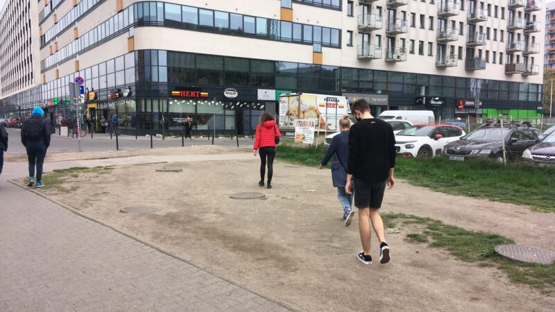 W ten sposób szanujemy trawniki – przerabiamy je na klepiska. Pamiętam gdy w tym miejscu był trawnik. Mieszkańcy od pierwszego dnia uruchamiania Herta, Biedronki i innych nie zauważali istnienia chodnika. „Dżentelmen” po lewej stronie kadru oszczędza 0.1 cennej sekundy jednocześnie walcząc z resztką trawnika.